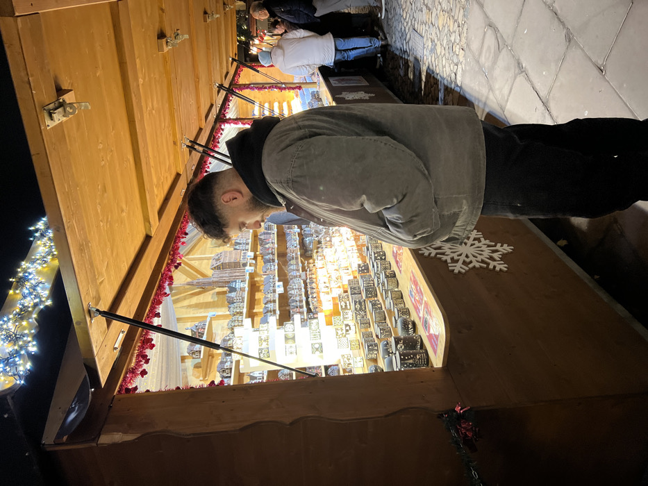 A person is standing and looking at a display of small wooden items arranged in rows and columns on a shelf. The display is under a wooden awning decorated with red garland. Above, there is a line of people in the background. The foreground features a wooden counter with a white snowflake decoration. Lights are visible on the left side of the image, possibly indicating it is evening or a festive event.