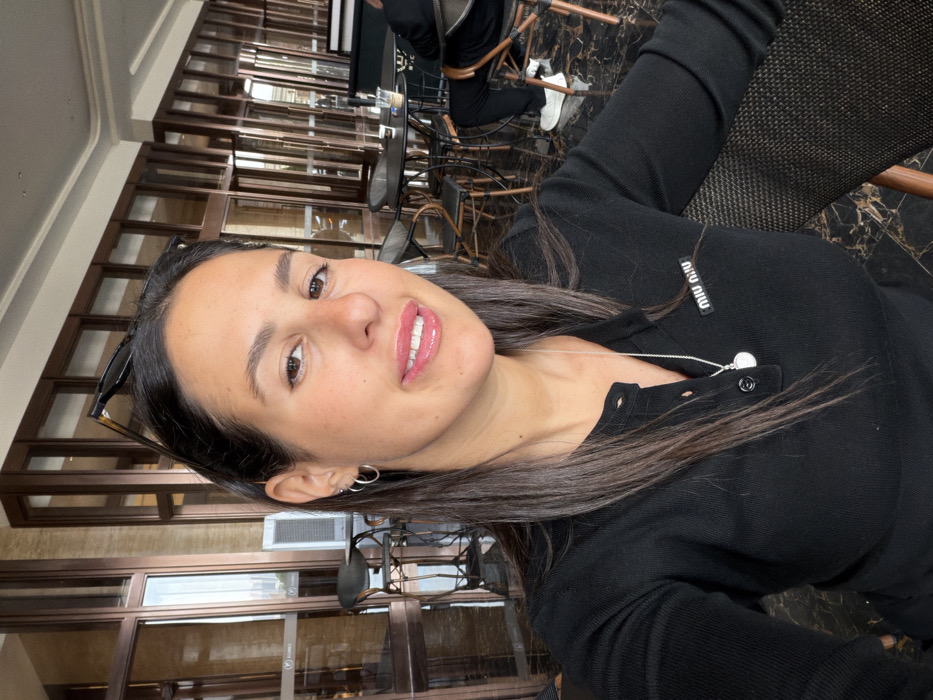 A woman with long, dark brown hair, wearing a black, long-sleeved, ribbed Henley-style shirt with a "miu miu" label on the left chest, is depicted in a close-up selfie, gazing directly at the camera with a slight smile and glossy pink lips