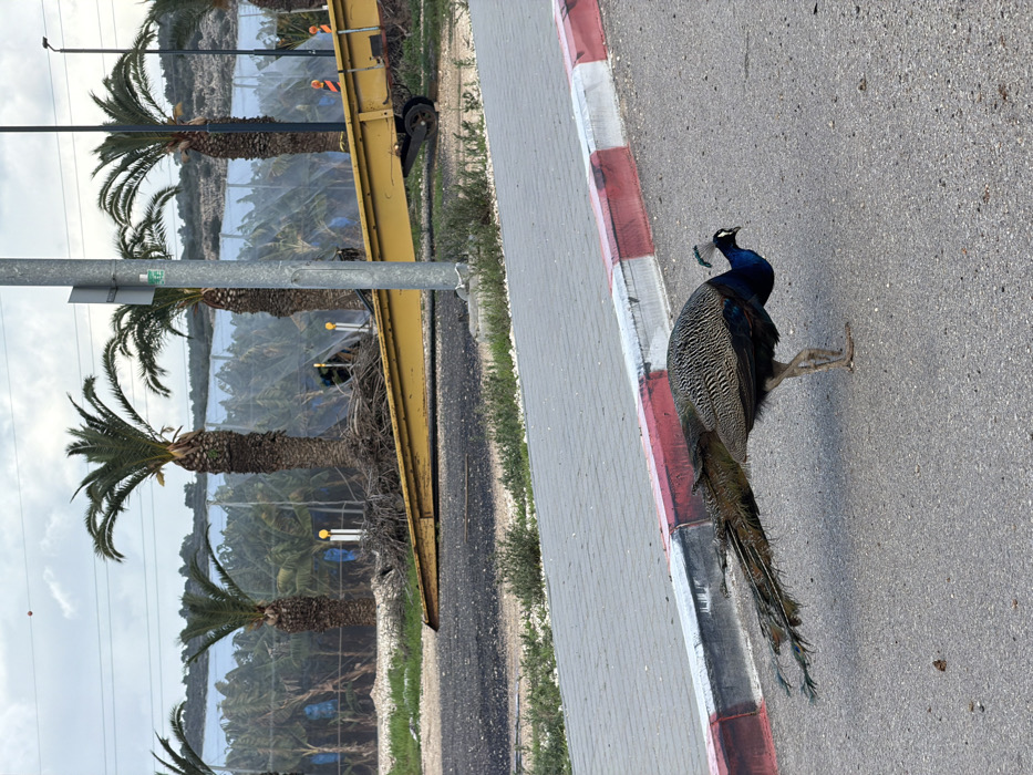 An Indian peafowl (Pavo cristatus) is observed walking right to left across a gray asphalt road in the Hof HaCarmel Regional Council, Israel. The bird displays a blue head and neck, a small crest, and a brown-patterned body with a long, dark, slightly tattered tail trailing behind it. Its posture suggests it is foraging or moving purposefully. To the left of the bird, a paved sidewalk with a red and white painted curb delineates the road. In the midground, a strip of sparse vegetation and dark soil precedes a line of mature palm trees with visible trunks and green fronds. Behind the palm trees, a large agricultural area covered by a translucent white netting system, likely a plantation, is visible, with some blue tarp material present within. A tall, gray metal pole, possibly a utility or light pole, stands prominently in the midground, to the right of the scene's center. A large, yellow piece of equipment, appearing to be a conveyor ramp or similar agricultural machinery, rests horizontally on the ground behind the palm trees and extends from near the gray pole to the right. The sky overhead is overcast.