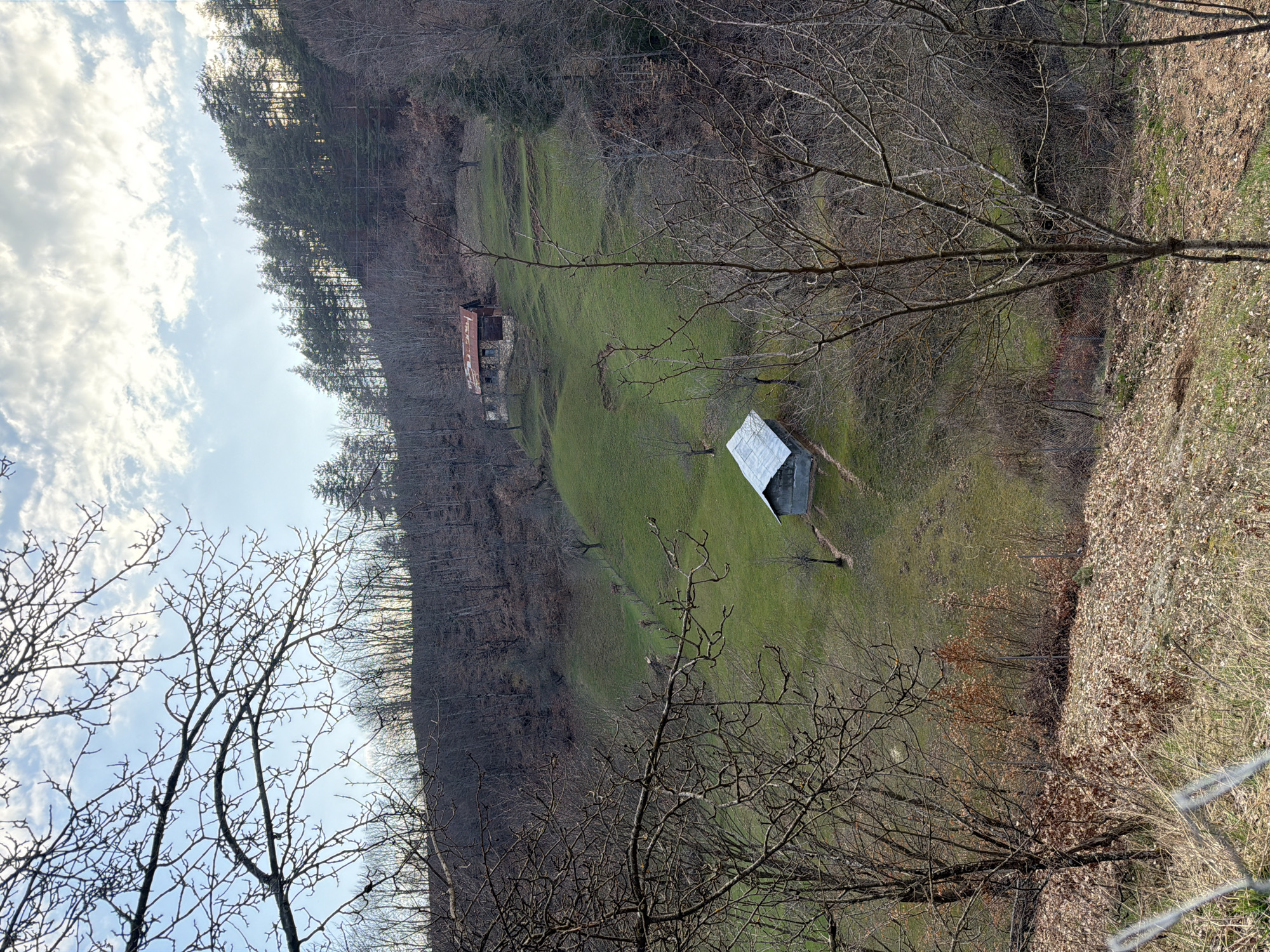 This image depicts a rural, hilly landscape in Zlatograd, Bulgaria, under a partially cloudy sky. In the foreground, bare deciduous tree branches frame the upper left and right, with a scattering of dry leaves and sparse dry grass on the ground. A light-colored fence is partially visible at the bottom left. The midground features a prominent green, grassy hillside sloping upwards from the lower left to the upper right. On the lower section of this slope, a small, rectangular outbuilding with a light gray corrugated metal roof and light-colored walls stands. A faint dirt path is visible near this structure. Further up the slope, a fence line with visible posts runs diagonally. Several additional bare deciduous trees are interspersed across the green terrain. In the background, positioned higher on the same slope, an older, rustic house with stone walls and a rusted red corrugated metal roof is visible. One side of this structure features a wooden facade. Behind this house, the hill rises further, densely covered with a forest composed of bare deciduous trees and evergreen conifers, the latter silhouetted against the sky at the ridge. No people are present, and no actions or interactions are observed.