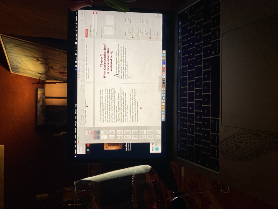 laptop displaying a document titled "On Meditations pages" on the left screen. The document appears to be a book chapter titled "Chapter 3: When God recognizes itself in the eyes of another awakened being." A webpage on YouTube with a thumbnail of a woman is visible at the bottom left of the screen. The laptop's keyboard and trackpad are visible on the right side of the screen. The background reveals a dimly lit room with a painting hanging on the wall. There is a glass of wine on the table in the foreground.