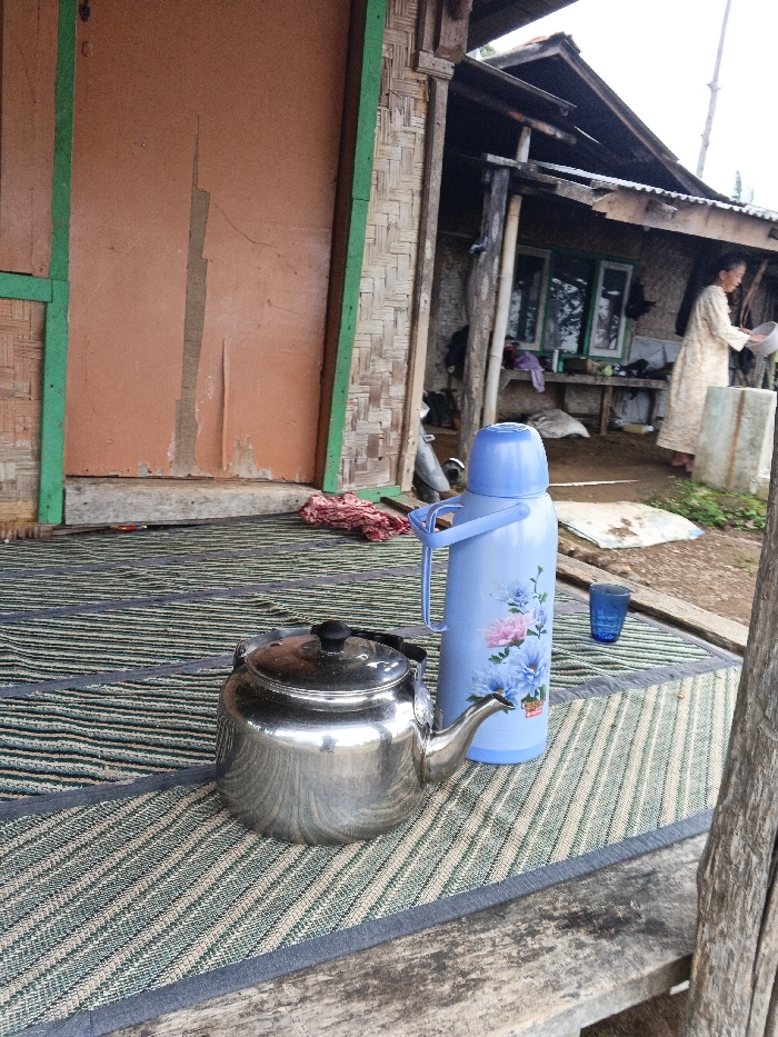 The image depicts a scene in Pinnwe, Myanmar (Burma), primarily on and around the raised wooden porch of a residential structure. In the foreground, positioned on a woven mat with diagonal green and light beige stripes, a silver-colored metal teapot with a black handle and lid knob rests in the lower-left area. To its right, a light blue plastic thermal flask, adorned with a floral pattern of pink and blue flowers, is equipped with a side handle and an integrated cup-lid; the brand "Lion Star" is partially visible. Further right on the mat, a small, empty blue glass tumbler is present. The background shows the dwelling, constructed with walls of woven bamboo matting and wooden planks. A prominent orange-brown wooden door, framed by green trim, is visible on the left side of the house. On the dirt ground directly below the porch and near the door frame, a quantity of red raw meat is situated. To the right of the foreground items, an older female individual with dark hair, wearing a light-colored, long-sleeved garment, stands on the bare earth. She holds a light-colored bowl in both hands, appearing to be in the process of handling its contents. The section of the house behind her features a green-framed window, wooden support posts, and a corrugated metal roof segment. Various household items, including footwear and fabric, are discernible underneath the elevated house structure, and a rough concrete block stands next to the woman.
