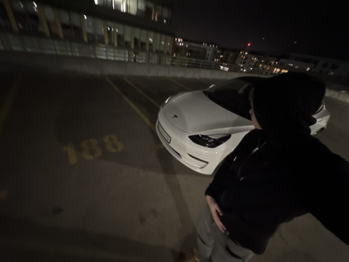 The image depicts an individual posing with a white Tesla electric vehicle at night on an upper-level outdoor parking area in Warsaw, Poland