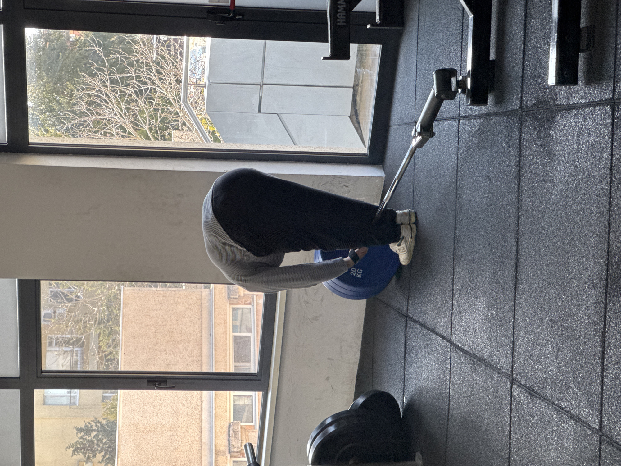 A person in dark pants, a grey top, and white athletic shoes is performing a barbell rollout with a blue 20-kilogram weight plate in what appears to be a gym with a dark rubber floor. The gym has windows that show a view of buildings and trees outside. The location in Primorsko, Bulgaria, cannot be verified from this image.