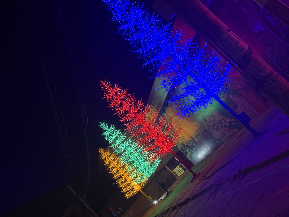 - "This nighttime image, captured in Quỳnh Lưu Commune, Vietnam, depicts a static urban scene dominated by four illuminated artificial trees arranged in a diagonal line" by FM-j42G22, licensed under CC BY 4.0