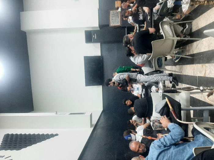 People are gathered in a room smoking hookah. There are several tables and chairs arranged throughout the space. The walls are two-toned, with a black bottom half and a white top half. A speaker, a television, and decorative textured art are on the walls. Hookah pipes are visible on tables among the groups of people.