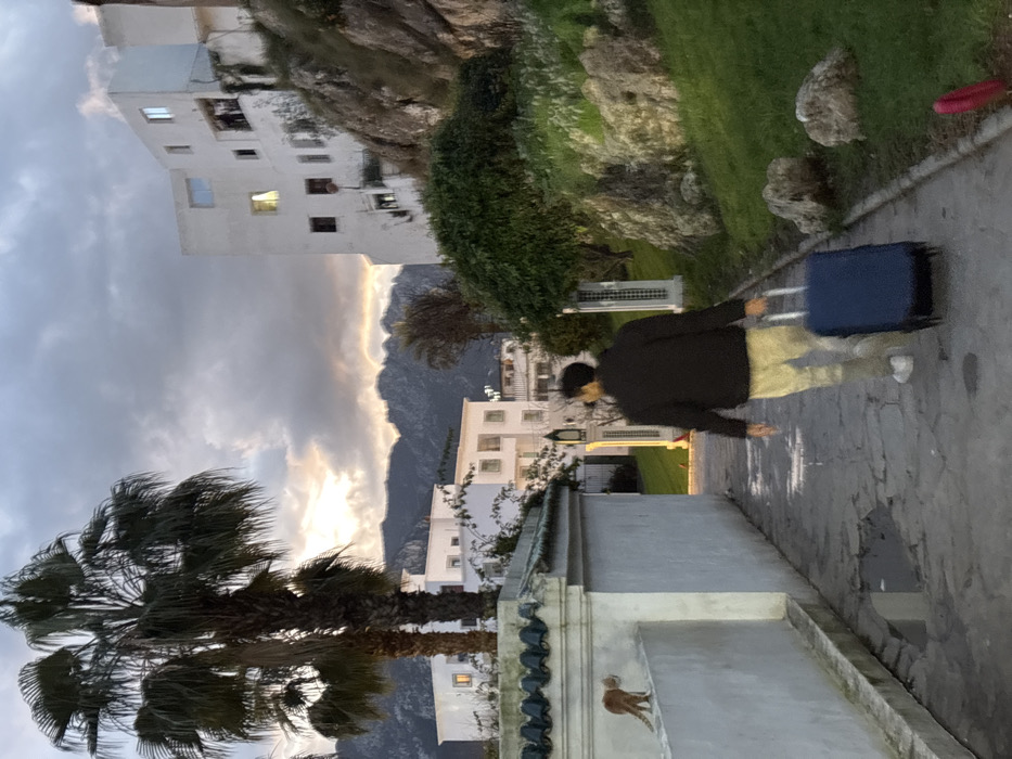 A person in a black blazer and light-colored pants walks away from the viewer, pulling a blue suitcase along a stone path. A white building complex lies on the left, with a palm tree in the foreground. Mountains rise in the background under a cloudy sky. The right side features a grassy area with rocks and a red object near the path's edge. A building with a painted monkey is in the foreground.