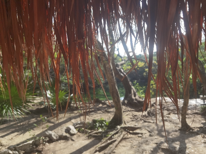 The image is a close-up view of a thatched roof, obscuring the view of the surrounding environment. The roof is made of dried, light brown palm leaves woven together. The roof is in a forested area, and through the gaps in the thatch, the viewer can see a tree trunk and a small, dry creek in the distance. The ground is dry and brown, and there are scattered leaves and rocks on the ground. The image was taken in San José, Mexico, at the coordinates 20.492 latitude and -87.258 longitude.