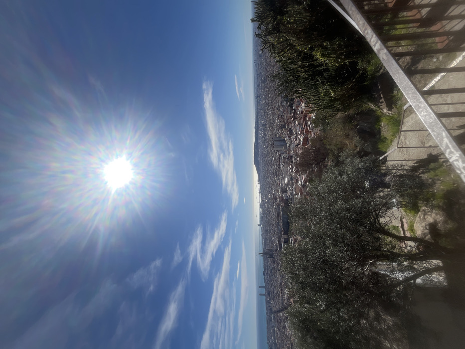 An elevated panoramic photograph captures the sprawling city of Barcelona, Spain, extending towards the Mediterranean Sea under a clear blue sky. The viewpoint is from a hillside overlook, likely in the northern part of the city (e.g., Bunkers del Carmel or Tibidabo foothills), facing southeast. The upper portion of the frame is dominated by a brilliant sun, centered high in the sky, emitting a distinct starburst flare. Wispy white clouds are scattered across the blue sky, primarily on the left side. Below the horizon, the dense urban fabric of Barcelona unfolds, characterized by countless buildings with reddish-brown rooftops. A prominent grid-like street pattern is visible in the mid-distance. The city stretches to a visible coastline, where the Mediterranean Sea shimmers under the sunlight. On the right side of the sea horizon, the distinctive silhouette of Montjuïc mountain is visible. Several taller buildings and structures punctuate the cityscape, particularly closer to the coastline. In the immediate foreground, natural vegetation and a man-made structure are present. To the left, a mature olive tree with silvery-green leaves partially obscures the view of the city directly below. To the right, dense green foliage, possibly a type of cactus or succulent, forms a bush-like mass. A metal handrail or railing, appearing aged and grey, extends diagonally from the lower right corner upwards and to the left, indicating a descending pathway or set of steps, which are partially visible below the railing, overgrown with sparse green grass and bare earth. No individuals are visible in the scene. The overall lighting suggests a bright, sunny day, likely midday or early afternoon.