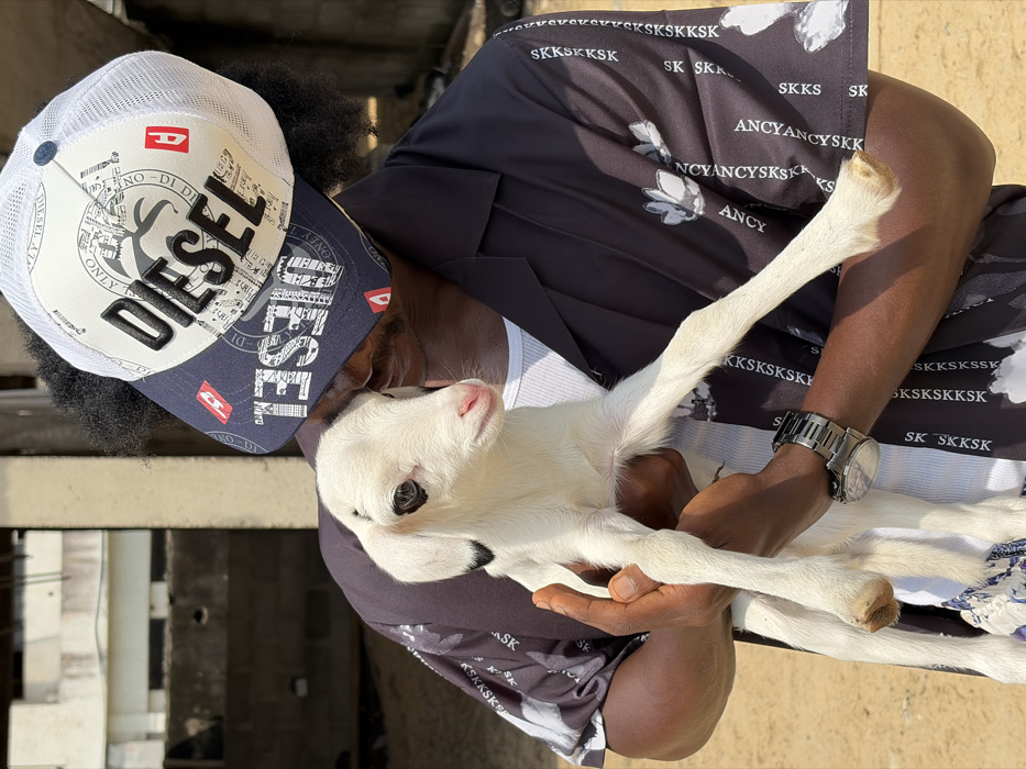 In Igboefon, Nigeria, an individual with dark skin and dark, curly hair is depicted outdoors, holding a small white lamb or kid