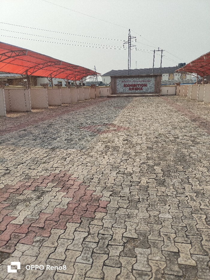 The image depicts an unoccupied outdoor exhibition area at Tafawa Balewa Square (TBS) in Lagos Island, Lagos, Nigeria