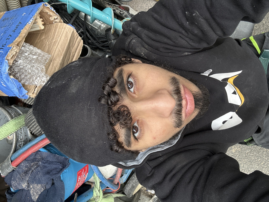 A male individual is depicted in a high-angle, close-up shot, looking directly at the camera. He has dark, curly hair visible at the forehead, a mustache, and a chin beard, and wears a black beanie or skullcap. His attire consists of a black hooded sweatshirt featuring a white and yellow graphic on the chest, with white debris visible on the fabric. A neon green strap is seen near his waist. The cluttered background includes a blue bucket, red and blue hoses, grey cylindrical containers, a light blue spiraled tool, and a torn cardboard box with bubble wrap, partially displaying the text '16-17 July'. The surface below the individual is grey. The location in the city of Orsay, France, is not verifiable from the image contents.