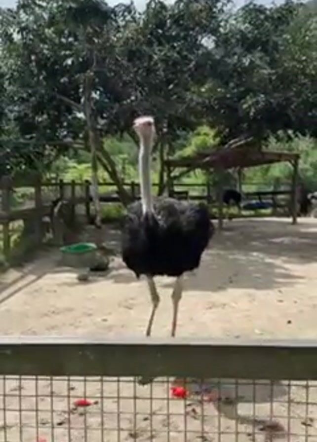 n ostrich standing in a sandy enclosure, viewed from behind a metal fence. The ostrich is predominantly black with a long white neck and pink beak. It stands in the center of the frame, looking directly at the camera. Behind it is a green feeding container, a wooden structure providing shade, and another ostrich in the background. The enclosure is bordered by wooden fences and lush green trees. The camera pans slightly to the left, revealing a hill covered in vegetation. The sky is partly cloudy.