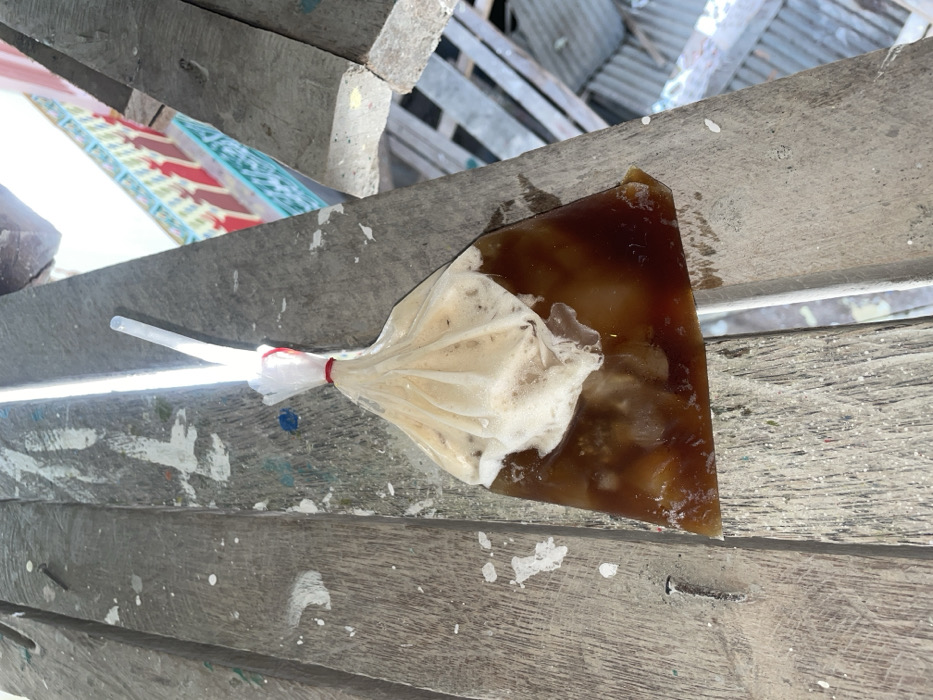 A clear plastic bag containing a dark brown liquid with lighter brown foam and translucent solid particles is depicted resting on a weathered, light gray wooden plank surface. A white plastic straw is inserted into the bag, which is secured at the top with a red elastic band. The wooden surface exhibits white, blue, and green paint splatters and visible nails. In the background, partially obscured, a building with a light blue railing and red, stylized balusters is visible. Additional indistinct structures, possibly corrugated metal, are present in the lower right background. The scene is located in Mns Asan, Indonesia.