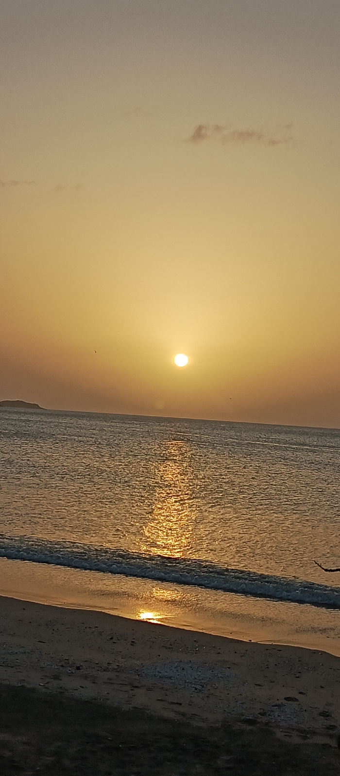 The image depicts a sunset over the Caribbean Sea at the city of Juan Griego, Venezuela. The horizon line bisects the frame horizontally, separating a gradient sky from the water and coastline. The sky exhibits warm tones, transitioning from a pale orange-yellow at the top to a more intense golden-orange near the horizon. The sun, a distinct white-yellow circular orb, is positioned slightly above the horizon on the right side of the frame. Several small, dark specks, consistent with birds, are visible in the sky above the water. The body of water reflects the sun's light, creating a shimmering, vertical path of golden-orange illumination extending from the sun towards the foreground. Gentle waves are visible near the shore, characterized by a thin line of white foam breaking onto the beach. A dark, indistinct landmass, likely a hill or island, is present on the far left horizon. The foreground consists of a dark, textured beach, appearing to be composed of sand and small pebbles or shell fragments. A dark, irregular object, possibly a branch or piece of debris, is partially visible entering the frame from the extreme right edge, at the intersection of the water and beach. No human subjects are present.