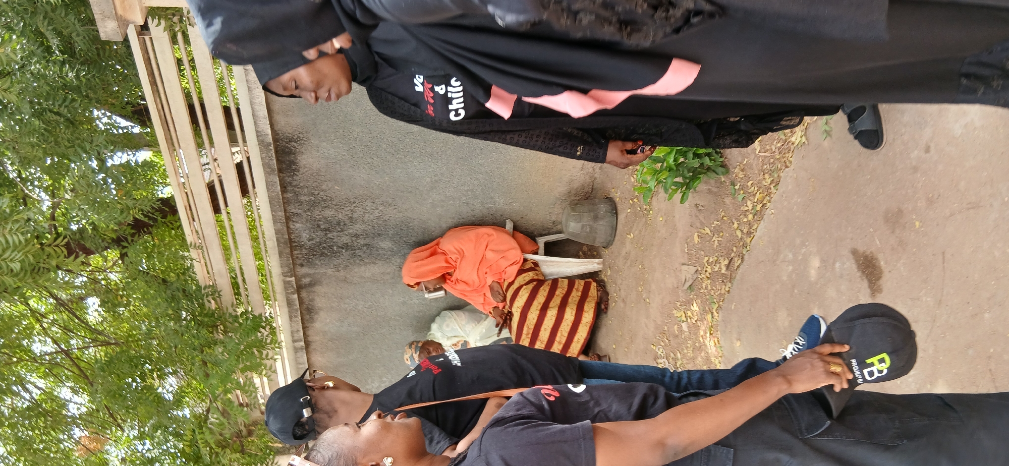 The scene depicts an outdoor gathering of six individuals, primarily women, in Unguwar Sarki, Nigeria. **Environment:** The background features a textured concrete wall, above which a horizontal slatted white fence or railing is visible. Lush green tree foliage extends across the top portion of the frame, suggesting a sunny day. The ground consists of a concrete path in the foreground, transitioning to dirt with scattered dry leaves near the wall. A small green plant grows at the base of the wall. A dark grey, bell-shaped object rests on the dirt. **Individuals and Objects:** 1. **Left foreground:** A woman with dark skin is partially visible, wearing a black t-shirt and dark trousers. She holds a black baseball cap with "PROJECT PB" text in white and green in her left hand, adorned with a gold ring. She wears blue and white athletic shoes. 2. **Left mid-ground:** A woman with dark skin wears a black baseball cap, gold hoop earrings, and a black t-shirt. A brown strap crosses her shoulder. Text on her shirt, partially visible, reads "For M & Children". She is looking towards the right. 3. **Center-left, seated:** An elderly woman, partially obscured, wears a light-colored head covering and garment. She is seated on an unseen surface against the wall. 4. **Center, seated:** A woman with dark skin is seated on a white plastic chair, leaning against the concrete wall. She wears an orange head covering, glasses, and a striped brown and tan skirt. She holds a white rectangular device, possibly a mobile phone, to her left ear. 5. **Right mid-ground:** A woman with dark skin wears a black hijab, a black abaya with pink trim, and a black t-shirt underneath. Text on her t-shirt reads "VG & Child". She wears black sandals. Her body is oriented towards the left, possibly in conversation. 6. **Right foreground:** A partial view of a sixth individual is visible, showing a black garment with pink trim and a portion of a hand, indicating another person present just outside the frame. **Actions and Interactions:** The individuals appear to be conversing or observing, suggesting a casual social gathering or event. The woman in the orange head covering is engaged with a device, while others face each other in an apparent interaction.