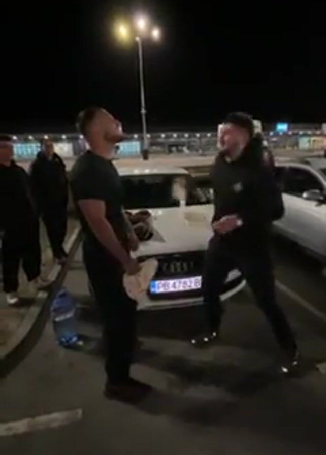 four men gathered in a parking lot at night. The primary focus is on two men standing in front of a white Audi. One man tosses a tortilla or pita into the air, and the other attempts to catch it in his mouth, failing and dropping it on the hood of the car. There is a large water bottle on the ground near the men. Other cars, streetlights, and a white box truck are visible in the background. The parking lot appears to be near a building or structure, suggested by the lighting and size of the lot. The license plate on the Audi is visible, showing PB 4782 BE.