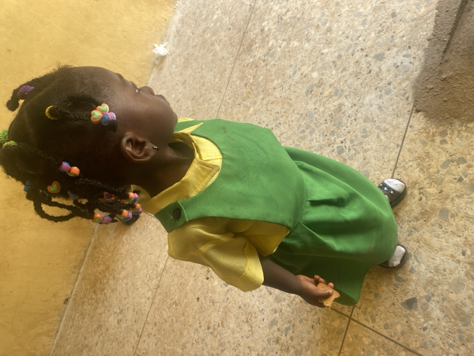 A young, dark-skinned child stands indoors on a light-colored, speckled tiled floor in Akwanga, Nigeria. The child wears a yellow collared shirt beneath a green pinafore dress. The hair is styled in multiple dark braids, each adorned with various multi-colored, heart-shaped plastic beads. A small silver hoop earring is visible in the child's right ear. The child holds a small, light-brown, irregularly shaped object in the right hand. Dark-colored shoes with white tips are worn on both feet. The child's gaze is directed towards the right side of the frame and slightly downward. A yellow-painted wall serves as the background, with a crumpled piece of white paper situated on the floor near the wall's base on the right. Natural light illuminates the scene, casting a partial shadow from an unseen object in the lower right foreground.