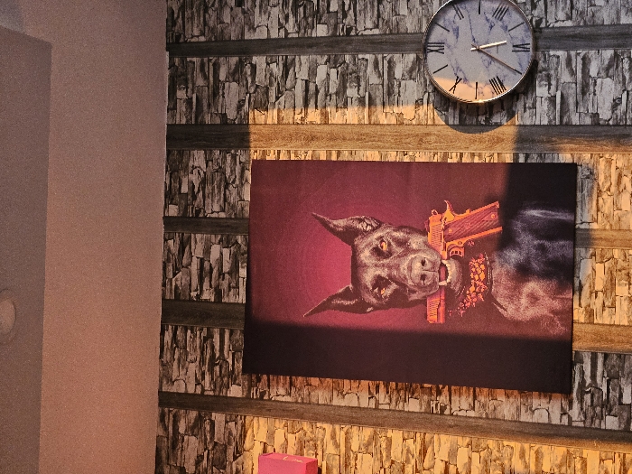 An indoor scene in the city of Voden, Bulgaria, features a wall decorated with wallpaper simulating stacked light-colored stones, interspersed with vertical dark wooden planks. Centered on the wall is a vertical rectangular canvas print depicting a dark-furred Doberman Pinscher dog with erect ears. The dog is shown from the chest up against a dark red background, holding a bright orange semi-automatic pistol horizontally in its mouth. A portion of the print, particularly the left side of the dog and the pistol, is illuminated by an orange light source from the left. To the right of the print, a circular wall clock with a metallic frame is mounted, displaying a white face with grey marbling and Roman numerals. The clock hands indicate approximately 4:57 or 5:57. Above the wall, a plain, light-colored ceiling with a single recessed light fixture in the top left corner is visible.