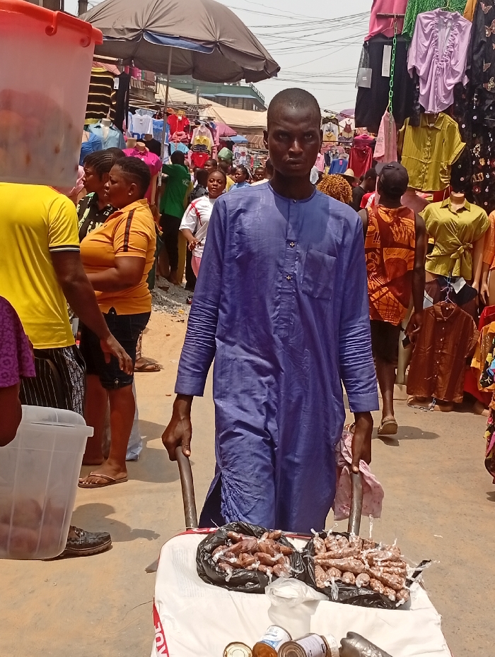 The image captures a crowded outdoor market in Fegge, Nigeria