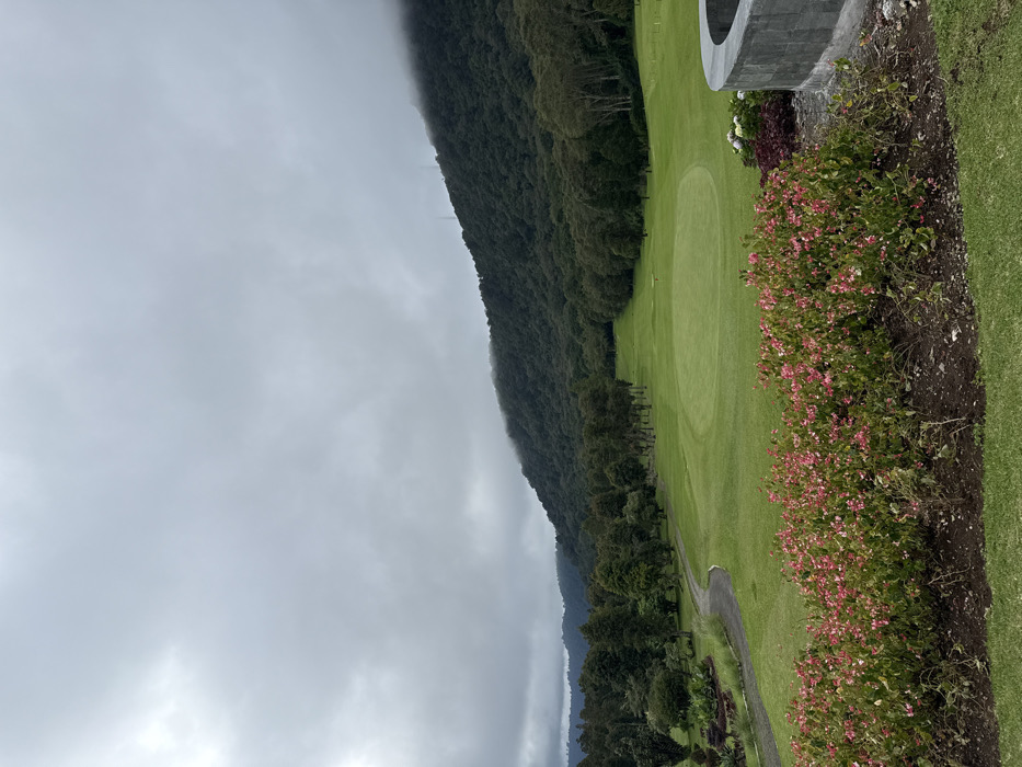 The image displays a golf course situated in Wanagiri, Indonesia, under an overcast sky. A large, heavily forested mountain range dominates the background, its upper slopes partially obscured by low-hanging grey clouds. Several slender vertical structures are faintly visible on the mountain's crest to the right. The golf course features vibrant green fairways and a distinct putting green with a red flag in the mid-ground. A winding dark grey paved path is visible on the left side of the mid-ground, leading toward the course. In the immediate foreground, a dense bed of pink-flowered plants, possibly begonias, is prominent. To the right of these flowers, a curved architectural element constructed from grey, rectangular stone tiles is partially visible. No individuals or animals are present in the scene.