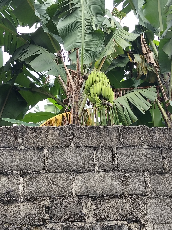 The image displays an outdoor scene in what is identified as Port-Harcourt, Nigeria. The lower half of the frame is occupied by a concrete block wall, constructed from textured, grey cinder blocks. The mortar joints between the blocks are visible and irregular, appearing light grey to off-white, with some areas showing signs of erosion or incomplete filling. The blocks themselves exhibit varying shades of grey, with darker stains and discoloration visible on some surfaces, suggesting weathering or accumulation. Above and behind this wall, a dense canopy of tropical vegetation, specifically banana plants, dominates the upper portion of the image. Multiple large, broad, green banana leaves are prominently featured, with some exhibiting minor tears or natural folds. Interspersed among the healthy green foliage are a few yellowed and dried banana leaves, indicating older growth. Visible are several fibrous, brown pseudostems of the banana plants. From one of these plants hangs a large, intact bunch of unripe, green bananas. The bananas are uniformly green, firm in appearance, and constitute a substantial cluster. The sky is partially visible through the leaves at the top, appearing light grey or overcast. No human figures, animals, or other specific man-made objects are present in the scene.