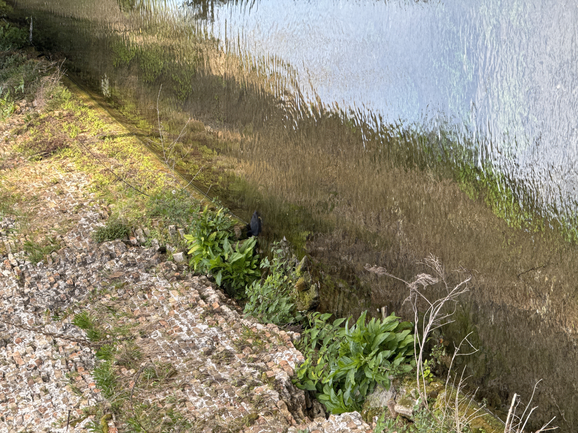The image captures a section of the Buranelli Canal in Treviso, Italy. The canal water has a rippled texture, reflecting the sky and surrounding structures, obscuring the detail of the reflected images. On the canal bank, a stepped structure made of old bricks is visible. Vegetation, including various plants and moss, grows on and between the bricks. A dark bird is perched on the canal bank amongst the plants.