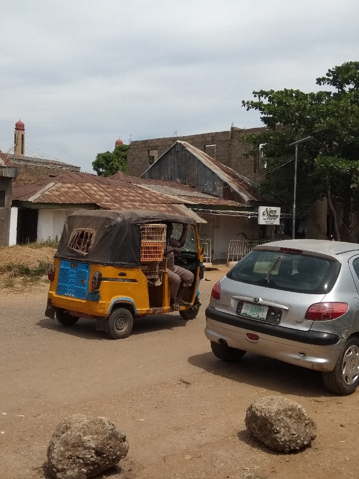 The image depicts an unpaved urban street scene in Maiburiji, Nigeria, under an overcast sky. In the foreground, two large, irregularly shaped rocks rest on the light brown dirt road. A yellow three-wheeled motorized tricycle, commonly known as a Keke Napep, with a black canopy is positioned centrally on the left, its rear facing the viewer. The rear features blue paneling with "TVS" branding. A driver, dressed in light-colored trousers and a dark shirt, is visible behind the wheel. Multiple orange plastic crates are stacked on the right passenger side of the tricycle. To the right, a silver two-door hatchback car, consistent with a Peugeot 206, is seen from the rear, displaying a Nigerian license plate that begins with "DL". In the background, a collection of single and multi-story buildings line the street. Structures are constructed from concrete blocks, some appearing unfinished, and many feature rusted corrugated iron roofs. A building on the right displays a sign that reads "Nazz Boutique". Farther back and to the left, two structures with reddish, dome-like tops, indicative of mosque minarets, are visible above the rooftops. A large green deciduous tree stands on the right, partially obscuring a building, alongside a pole fitted with a solar light fixture.