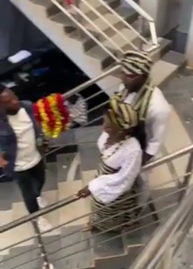 A medium-shot video pans up from a couple ascending a staircase, to show an interior decorated for the holidays. The couple, dressed in festive attire including striped wraps, are walking up a set of stairs with metal railings. A man in a blue denim jacket, who appears to be filming, walks behind them. The staircase is decorated with red and yellow garlands. A chandelier hangs from the ceiling. The interior appears to be a building hall or lobby, decorated for Christmas, with a reception desk, television, and signage in the background. The building has a modern appearance.