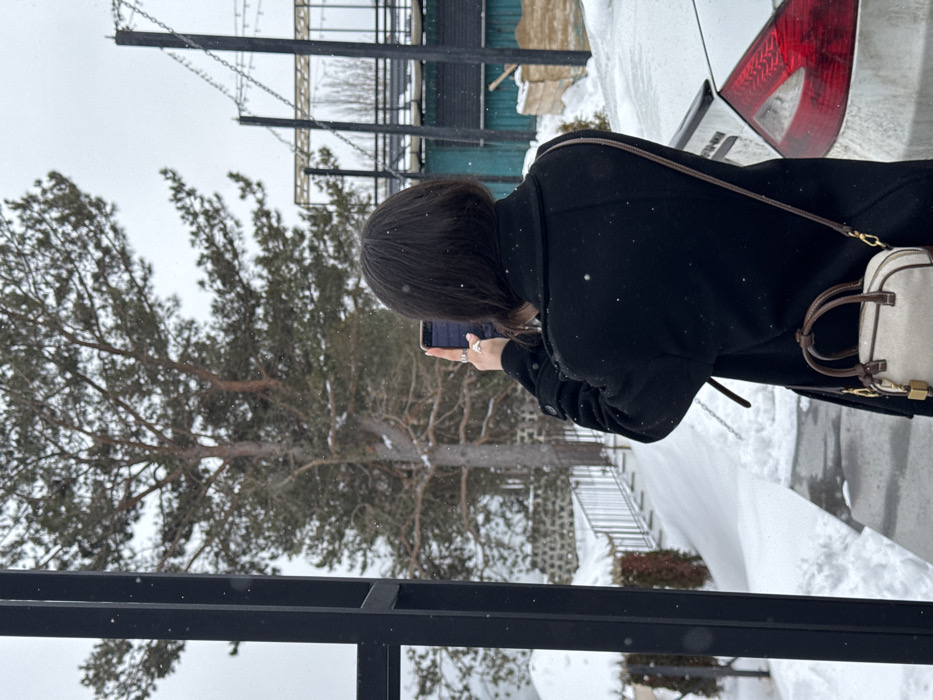 The image depicts an outdoor winter scene in Tsamakaberd, Armenia, characterized by light snowfall under an overcast sky. A lone individual, viewed from behind, stands centrally, wearing a dark, long coat and possessing dark, shoulder-length hair. The person is holding a dark-colored smartphone horizontally with both hands, as if recording or photographing; rings are visible on the left hand, and the phone screen shows a blue/purple display. A small, light-colored handbag with brown trim and a golden padlock-like charm is slung over their right shoulder. The ground is covered in snow, with a dark, partially cleared path visible to the left. A black vertical metal structure occupies the left foreground. The rear section of a light-colored vehicle, including its trunk and tail light, is visible on the right. The background features a large tree with snow-dusted branches, flanked by a snowy metal railing and a stone wall on the left, and various metal structures with turquoise panels and strung lights on the right.