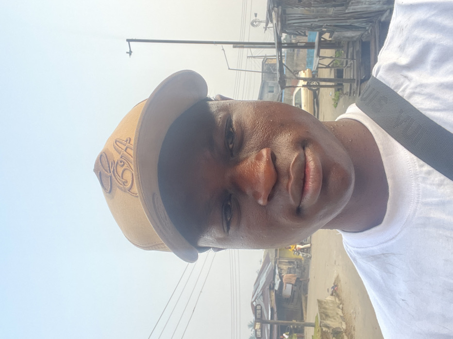 A selfie shows a person wearing a white t-shirt and beige baseball cap with embroidered design. They have dark skin and a black strap goes across their shoulder. The background reveals a slightly run-down urban environment with overhead power lines and simple building structures. The light is bright, creating a slightly hazy atmosphere. A windmill and water tower are faintly visible in the background.