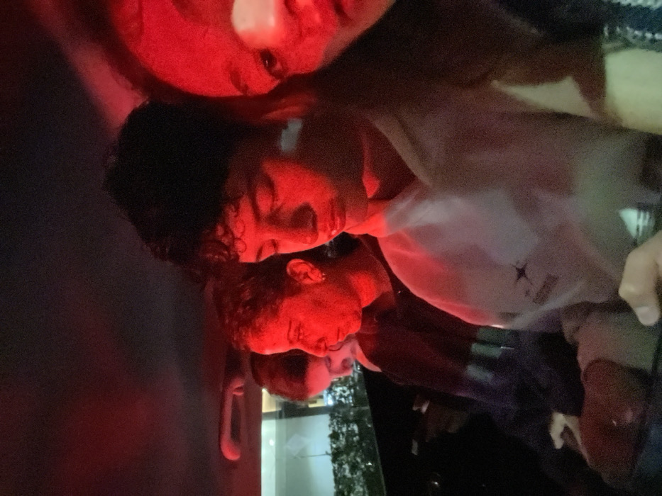 The image depicts four individuals seated inside a vehicle, located in Atlixco, Mexico. The scene is heavily illuminated by a strong red light source, casting a deep red hue across all subjects and the immediate environment. The vehicle's dark roof lining is visible at the top. Through a window on the far left, blurry external lighting and what appears to be foliage are visible. From left to right: 1. A person, partially visible, with their head lowered, wearing dark attire. 2. A female with short, dark, curly hair, facing forward with her head slightly turned to her right. She wears a dark top and an earring is visible on her left ear. Her face is strongly illuminated in red. 3. A male with dark, curly hair, facing forward with his eyes either closed or looking downwards. He is wearing a light-colored hooded sweatshirt with a dark graphic logo on the chest. His hands are positioned in the lower center of the frame, holding an object resembling a smartphone. His face is also deeply colored by the red light. 4. On the far right, the right side of a fourth individual's face (cheek, nose, and part of an eye) is visible in extreme close-up, suggesting this person is operating the camera. This individual's face is also intensely red. All individuals appear to be seated as passengers. There are no explicit interactions between the subjects.