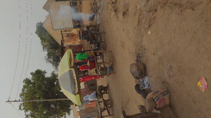 An outdoor market scene features individuals engaging in various activities. A covered stall displays an array of items. Further back, a structure emits smoke, indicating cooking or burning. People are positioned near wooden tables and structures. The ground is bare and dusty, with scattered debris. Overhead power lines stretch across the sky.