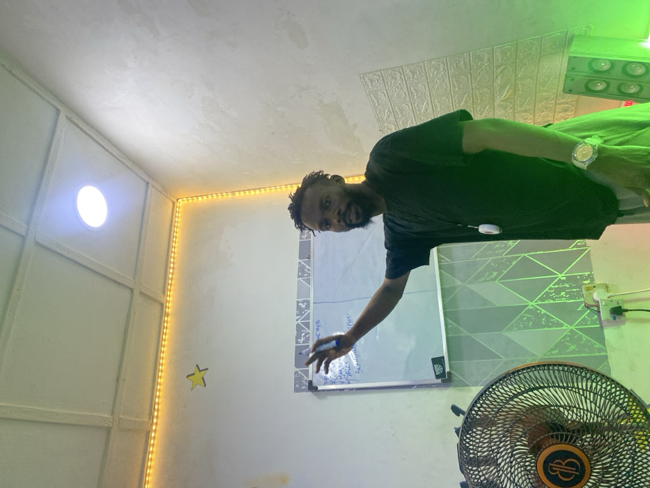 A medium shot captures a dark-skinned male subject, approximately 20-40 years old, with a beard and dreadlocks, standing in an indoor room. He wears a black short-sleeved shirt, light-colored trousers, a white watch on his left wrist, and a white lanyard around his neck. His right arm is extended upwards and forward, holding a blue marker pen, while he faces the viewer. The room features light-colored, textured walls and a panelled ceiling. A bright circular LED light is recessed in the ceiling, complemented by yellow LED strip lights running along the upper wall perimeter. A yellow star decoration is affixed to the upper left wall. Behind the subject, a rectangular whiteboard is mounted on the wall, displaying some handwritten text including "NC HUB" and "BRANDING," and has a grey and white patterned border. A dark-colored oscillating fan with a "B" logo on its cage is partially visible in the lower-left foreground. Below the whiteboard, a section of wall is covered with grey geometric patterned panels, featuring two white electrical outlets, one with a white plug inserted. A pair of grey speakers are partially visible on the right, illuminated by a green light source. The scene is located in Yelwa, Nigeria.