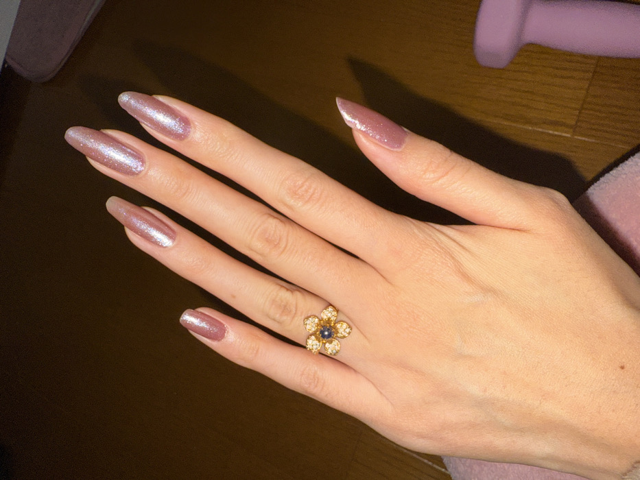 A close-up image displays a human hand, likely female, with fair skin tone. The fingernails are long, with an almond to soft coffin shape, and are coated in a shimmering, iridescent dusty rose or mauve nail polish. A gold-toned ring is worn on the fourth digit (ring finger) of the hand. The ring features a flower design, with a central dark blue, possibly sapphire, cabochon stone surrounded by eight smaller, clear, faceted stones forming petals. The hand appears to be resting on a soft, light pink or purple textured material, possibly fabric. In the background, dark brown wooden floorboards are visible, along with a blurred, light purple object on the lower right. The specific location in the city of Kawasaki, Japan, cannot be determined from the visual information provided in the image.