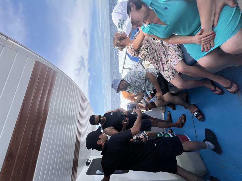 A group of people are on a boat. Several are seated, with at least three individuals looking towards the water. They wear casual clothing, including T-shirts, shorts, dresses, and hats. One person is holding a water bottle. Some wear flip-flops. The boat's side is visible with white and brown stripes. The sky is bright with a few clouds, indicating a sunny day. The water shows the boat's wake.