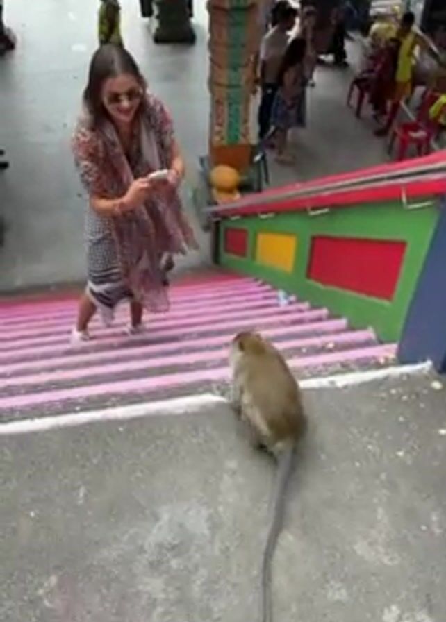 A woman with long brown hair is looking down at a monkey in front of her. She is standing near the top of a long set of stairs. The stairs have colorful sides, with pink steps. The woman is holding a cell phone and seems to be taking a picture of the monkey, who is squatting on the flat area at the top of the stairs. Behind the woman are various other people standing around and walking.