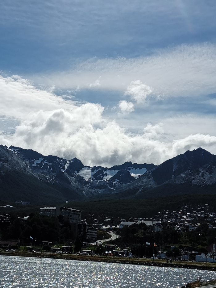 A scenic view showcasing a body of water with glittering reflections. In the distance, a town nestles against a backdrop of dark, forested hills leading to snow-capped mountains under a sky filled with scattered white clouds. The sky transitions from light blue to gray. The town includes closely spaced buildings and a winding road.