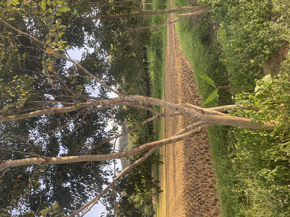The image displays a rural agricultural landscape in Ban Mae Ping, Thailand. In the foreground, a cluster of deciduous trees with light brown bark and green foliage stands, partially obscuring the view. Dense green undergrowth and grasses cover the ground immediately beneath these trees, with a small banana plant featuring two broad leaves visible to the right. The midground features a large, rectangular field of harvested crops, characterized by uniform rows of straw-colored stubble, consistent with a recently harvested rice paddy. A narrow strip of vibrant green vegetation separates the foreground foliage from the edge of this field. Beyond the harvested field, a distinct line of evergreen trees with dark green canopies marks a distant boundary. The background consists of rolling hills or mountains, heavily forested with green trees, set against a clear, light blue sky with minimal cloud cover. No individuals, animals, or man-made structures are visible. The scene is illuminated by natural light, casting subtle shadows.