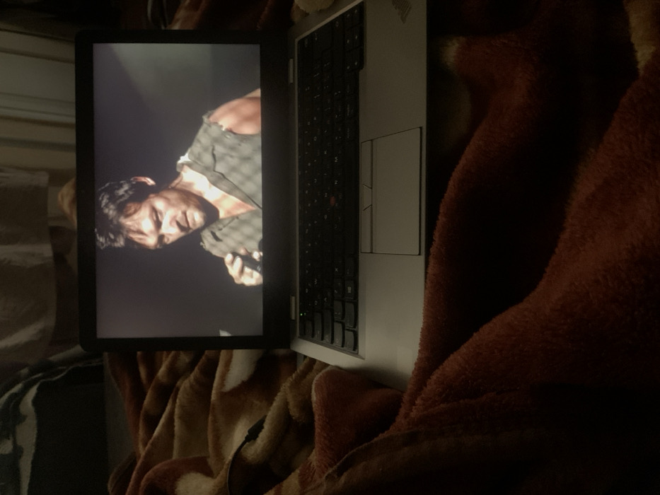 This image depicts a dimly lit indoor scene in Bohuslav, Ukraine. A silver-colored laptop, possibly a Lenovo ThinkPad, is positioned on a rumpled, thick blanket with an orange-brown base color and lighter patterned sections. The laptop screen displays a video featuring a male individual with short dark hair, a serious facial expression, and visible dirt or grime on his face. He wears a sleeveless, dark plaid or patterned shirt with torn edges and appears to be holding a dark, indistinct object in his right hand. The laptop's keyboard and trackpad are visible below the screen. The immediate environment consists solely of the blanket and the laptop, with the background obscured by darkness and blur. No other individuals are present in the observable scene. The primary action is the viewing of media on the laptop.