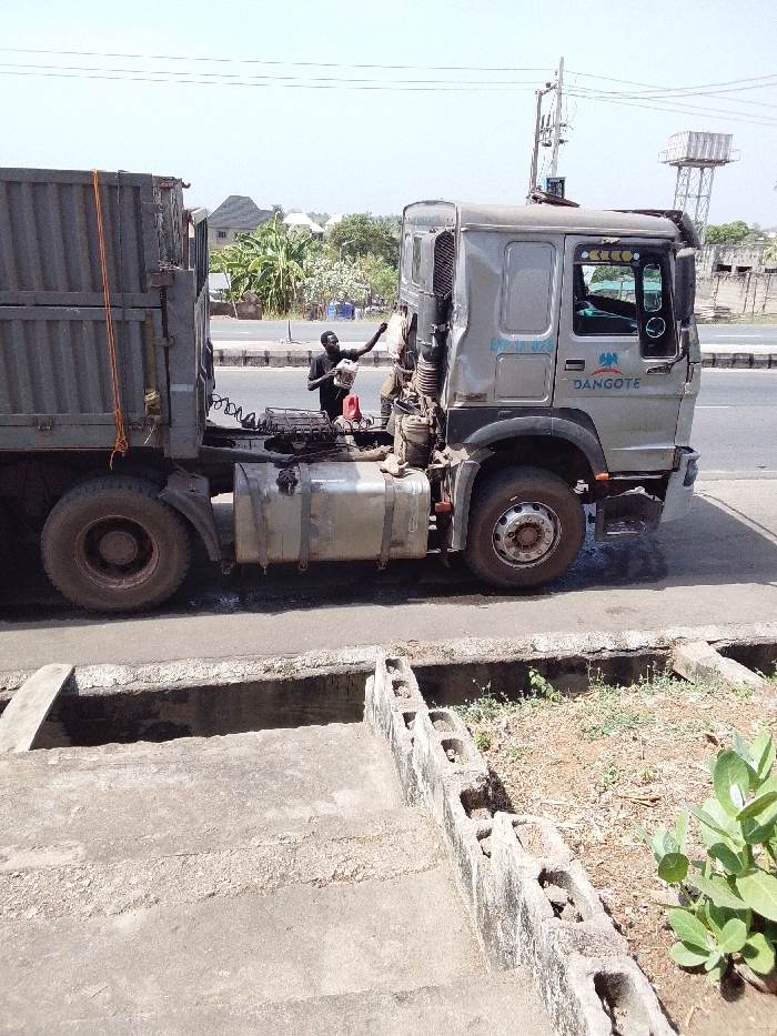 The scene depicts a grey articulated truck stopped on the shoulder of an asphalt road in Lokoja, Nigeria, under clear daylight conditions