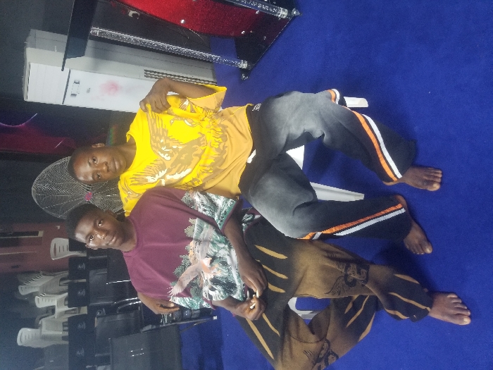 Two young males are seated barefoot on white plastic chairs atop a bright blue carpeted floor in an indoor public or semi-public space in Onitsha, Nigeria. The precise street address or landmark is not discernible from the visual evidence. The male on the left wears a maroon short-sleeved t-shirt with a landscape design featuring a flying eagle, paired with loose-fitting brown and black patterned pants. He has his right arm around the shoulder of the male on the right and holds a small white object in his lap with both hands. His gaze is slightly to the left of the camera. The male on the right wears a yellow short-sleeved t-shirt with a large brown eagle graphic and loose-fitting black pants with orange and white stripes along the outer seams. He has his left arm around the shoulder of the male on the left and holds his shirt near his chest with his left hand. He looks directly towards the camera. In the background, stacked white plastic chairs and dark chairs with metal frames are visible on the left. A large silver-colored industrial-style standing fan is positioned in the center. To the right, a tall, white, rectangular split-unit air conditioning component is present, with a dark, shiny podium or display stand featuring red accents partially visible next to it.