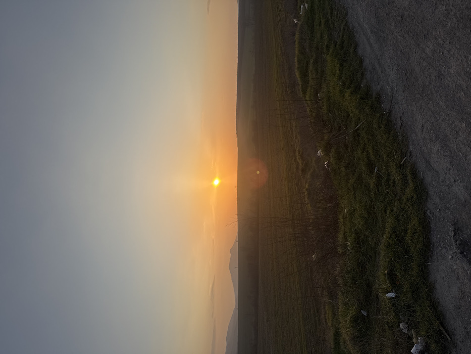The image depicts a rural landscape at sunset in Struino, Bulgaria. The sky transitions from a light blue-grey at the top to a bright orange and yellow towards the horizon. A prominent, circular yellow sun is positioned centrally on the horizon, emitting a distinct lens flare below it. Low-lying, dark hills are visible on the far left of the horizon. The midground features expansive, uncultivated or recently planted fields, displaying dark green and brown soil tones. The foreground includes a strip of dry, sparse vegetation with bare branches running horizontally, containing visible scattered white litter (e.g., plastic bags, paper). To the right, a segment of a dark, unpaved dirt or gravel road is visible, bordered by a mound of green grass also containing white litter. No individuals, animals, or specific actions are observed.