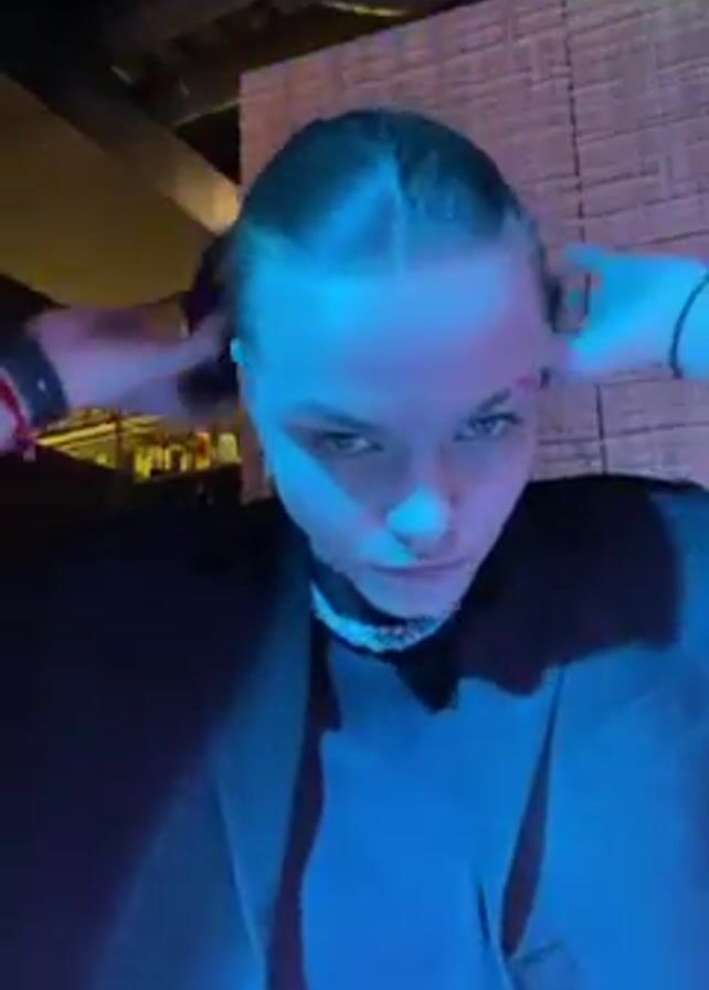 A close-up vertical video shows a young adult person with short dark hair pulling headphones down around their neck. They are wearing a black blazer over a black shirt, a white beaded necklace, and have a piercing in their nose. They are looking at the camera with a slight smile. The lighting is primarily blue with some hints of purple. Behind them is a textured wall and a bar with bottles. Music is playing in the background.