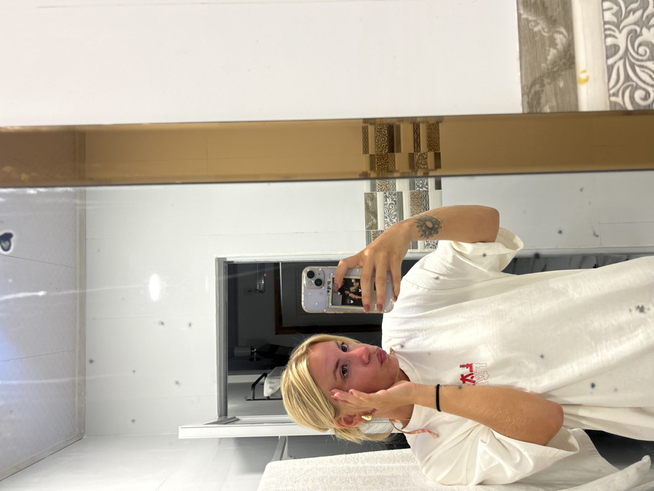 A mirrored selfie captures a blonde woman in a white t-shirt