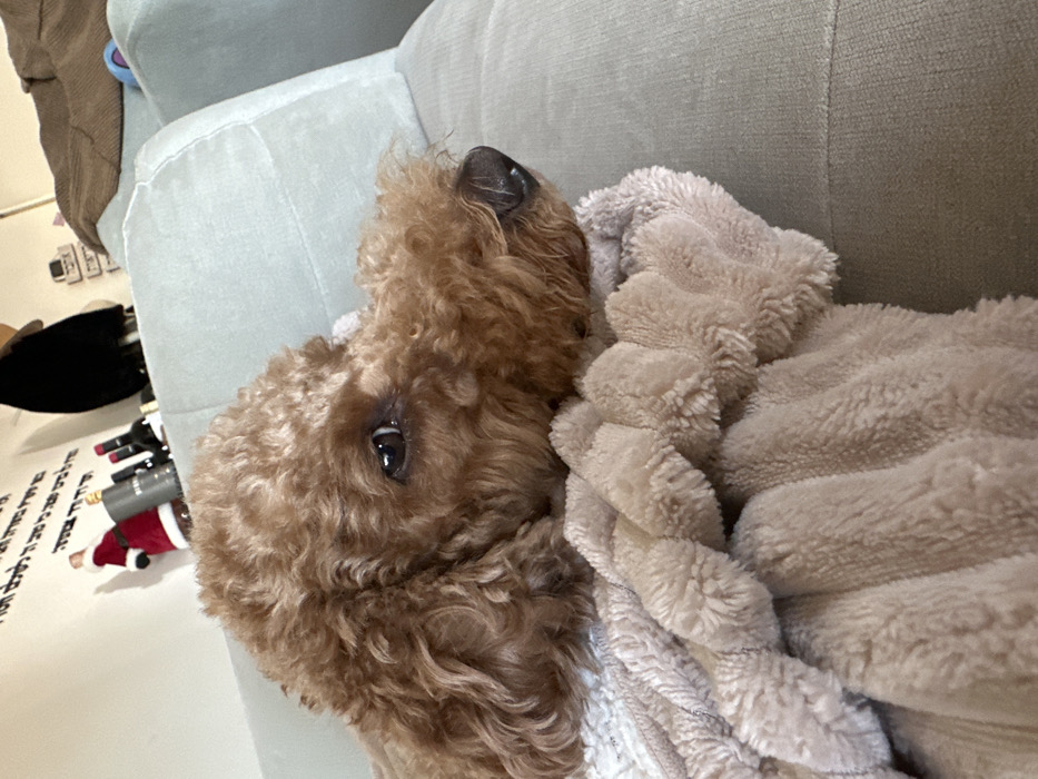 A reddish-brown, curly-haired dog, appearing to be a Poodle, is positioned on a light-toned fabric sofa, partially covered by a light beige, plush, ribbed blanket