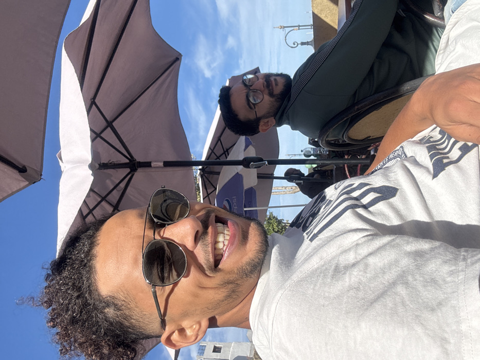 This image captures an outdoor daytime scene at a cafe in Tangier, Morocco, possibly overlooking a waterfront area. In the foreground, a man with dark, curly hair, a beard, and a mustache is positioned to the left, smiling broadly towards the camera. He wears dark aviator-style sunglasses with metal frames and a white short-sleeved t-shirt featuring a dark, possibly blue, graphic design. He is seated, with his left arm partially visible. To his right and slightly behind him, a second man is seated in a chair with a light brown upholstered back and a dark frame. He has dark hair, a beard, and wears round-rimmed glasses. He is dressed in a dark green long-sleeved jacket with a light-colored stripe running down the sleeves and appears to be looking towards the camera with a slight smile. A black strap, likely from a bag, is visible across his shoulder. The background shows a clear blue sky. Several light-colored outdoor parasols are visible, providing shade, one of which displays a partial Pepsi logo underneath. A plastic bottle of water is on a table next to the second man. Further in the background, a third person is partially visible in silhouette, seated under an umbrella. Architectural elements of a light-colored building are visible on the far left, and a decorative black streetlamp can be seen on the right, suggesting a public promenade or waterfront setting. The scene is brightly illuminated by direct sunlight, indicating clear weather.