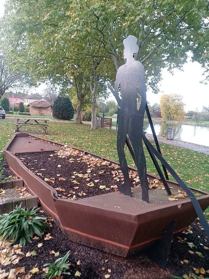 The image depicts an outdoor scene in Souffelweyersheim, France, centered on a metallic sculpture. The foreground features a rust-colored metal boat structure, approximately 2 meters in length, functioning as a planter filled with dark brown mulch and scattered dry autumn leaves. A dark gray, two-dimensional metal silhouette of a person stands within the boat's stern, facing away from the viewer. The silhouette, wearing a hat, holds a pole-like object diagonally across its form. The sculpture is situated on a grassy expanse strewn with dry, light-brown autumn leaves and dark ground cover. In the mid-ground, a row of mature deciduous trees with green and yellowish leaves extends horizontally. To the right, a calm body of water, possibly a pond or canal, is visible, bordered by a paved path and additional vegetation. The background on the left side reveals a light-colored residential building with a brown roof, partially obscured by trees. Adjacent to it stands a smaller, light brown brick-like structure with a red door and a dark brown roof. A wooden picnic table with attached benches is positioned between the boat sculpture and these background buildings. A silver-colored vehicle is partially visible on the far left. The sky is overcast and uniformly light gray.