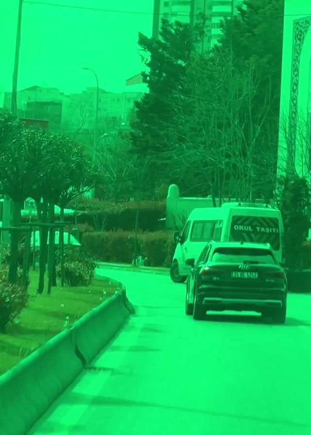 A vehicle drives on a street in Istanbul, Turkey. The view is filtered through a green tint. The rear of a black Audi SUV is visible, license plate 34 BC 6242, and a school van is parked nearby with “OKUL TAŞITI” (School Bus) visible on the back. Pedestrian crossing signs are visible on the side of the road, as are some buildings and trees. The road has a concrete median.