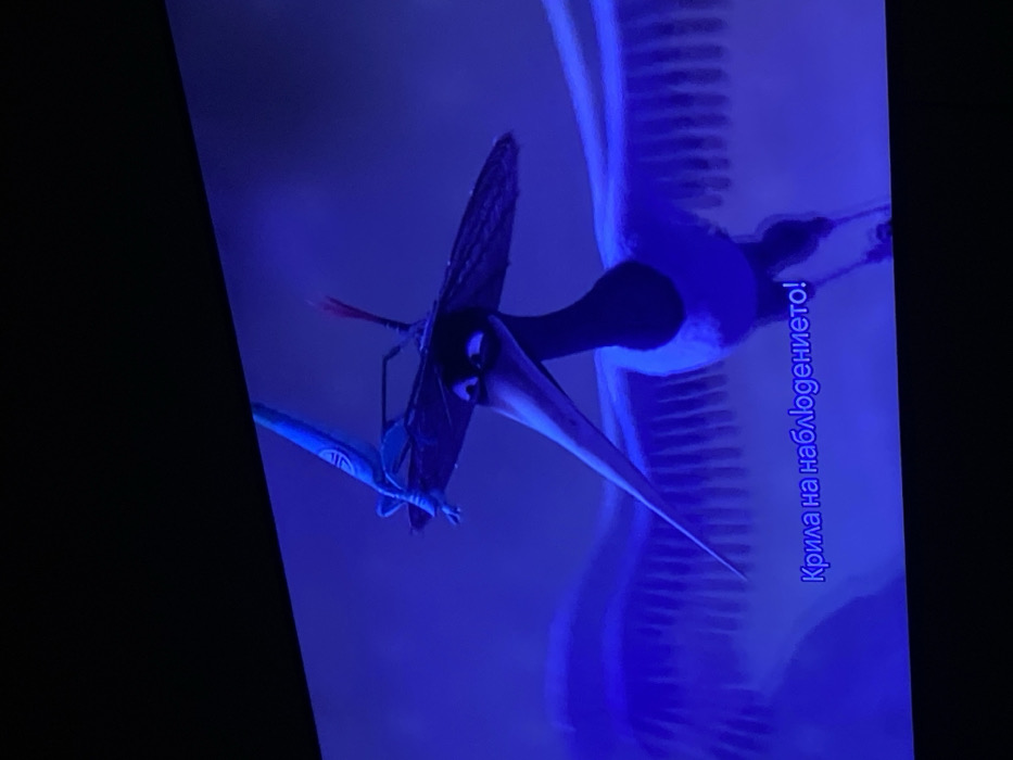 This image captures an animated scene displayed on a screen, characterized by a dominant blue ambient lighting. The central subject is a cartoon bird-like character, possessing a long, pointed beak, a black head and neck, and a white body with spread wings, suggesting flight. The bird wears a wide-brimmed, flat, woven hat adorned with a reddish-brown feather or tassel on its proper left side. Perched on the hat brim is a small, elongated, light blue creature with a distinctive circular symbol on its back. The background is a uniform, blurred blue field. White Cyrillic text reading "Крила на наблюдението!" (translating to "Wings of observation!") is visible at the lower-left portion of the screen. The animated scene itself does not possess a real-world geographic location; however, the image capture is contextually placed in the city of Dobri dial, Bulgaria.